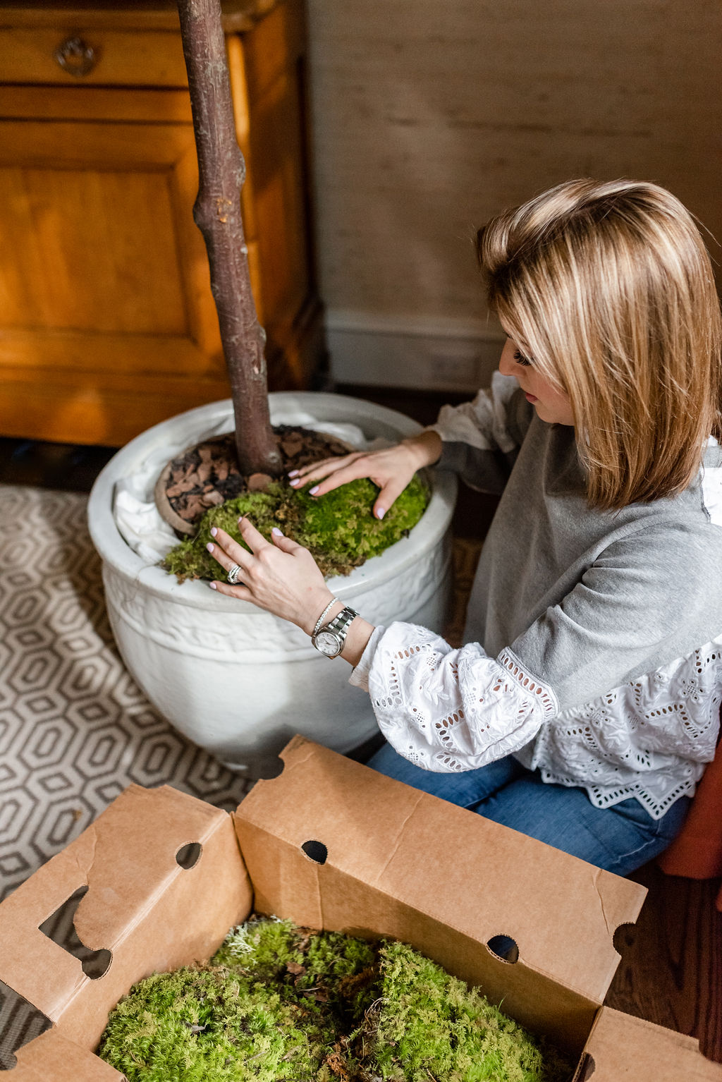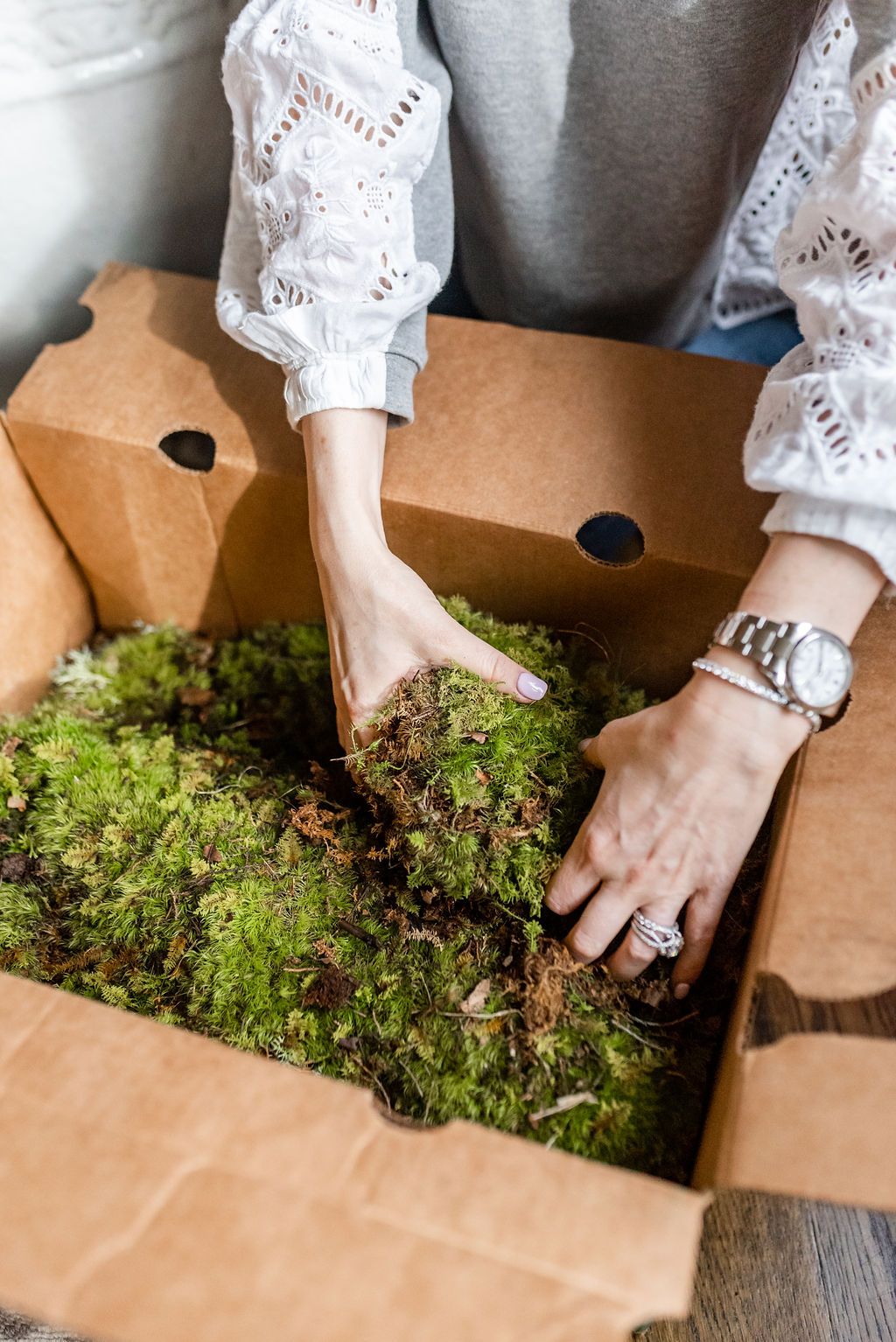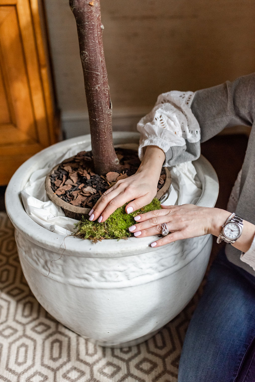 My faux fig tree has been sitting in an empty pot for about a year. I decided it was finally time to style it with some live moss. I purchased my box of moss for about $35 at my local wholesale flower market. If you don’t have access to a wholesale market, get your local florist to grab you a box. I’ve also been on hikes before where I’ve seen luscious patches of moss, so you can also gather it fresh if you see it! This could be an excellent treasure hunt activity during quarantine 😉 This can be done on any house plant, real or fake. This is especially pretty with a bedside fern or a potted hydrangea on your counter. Here are the steps on how to style your moss: