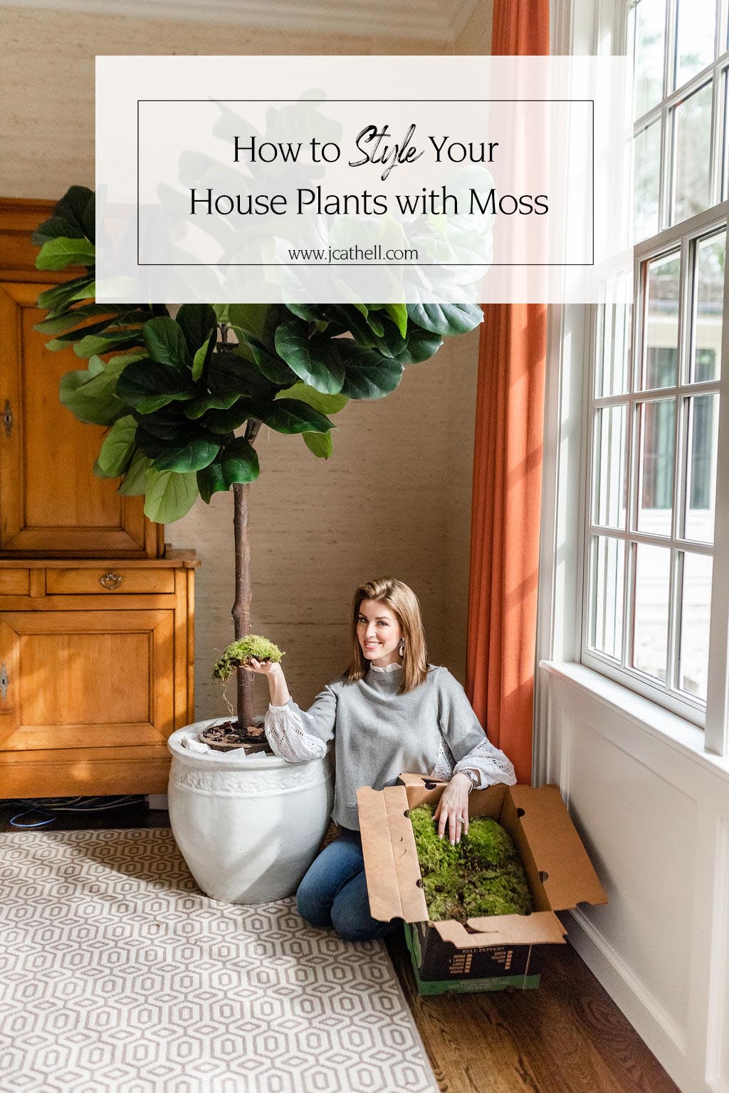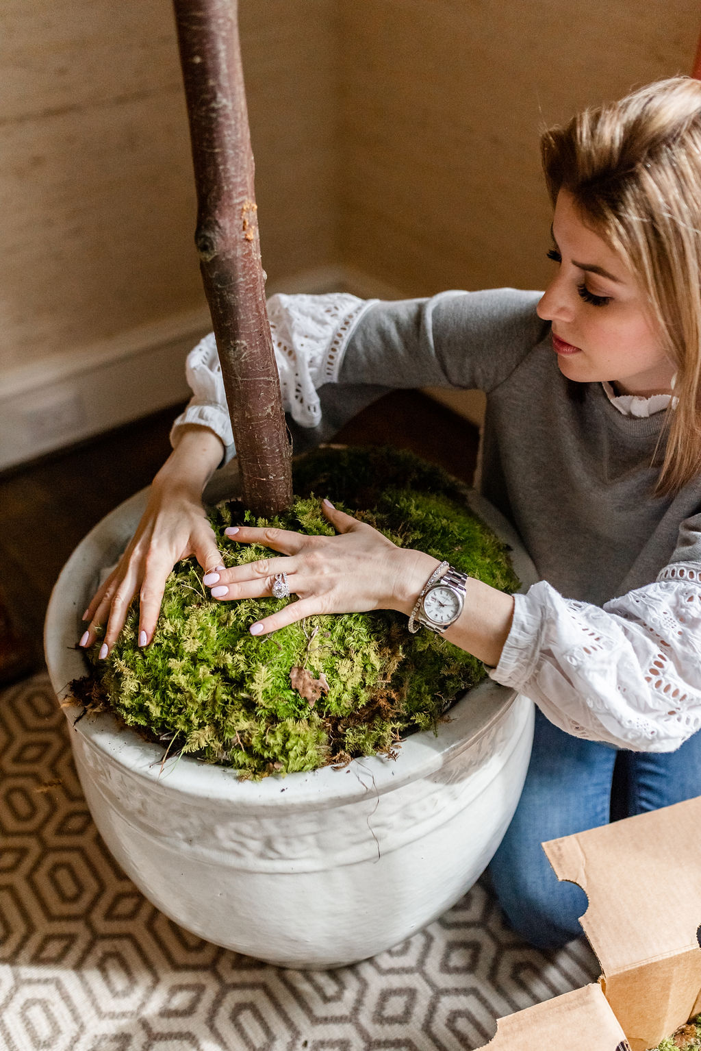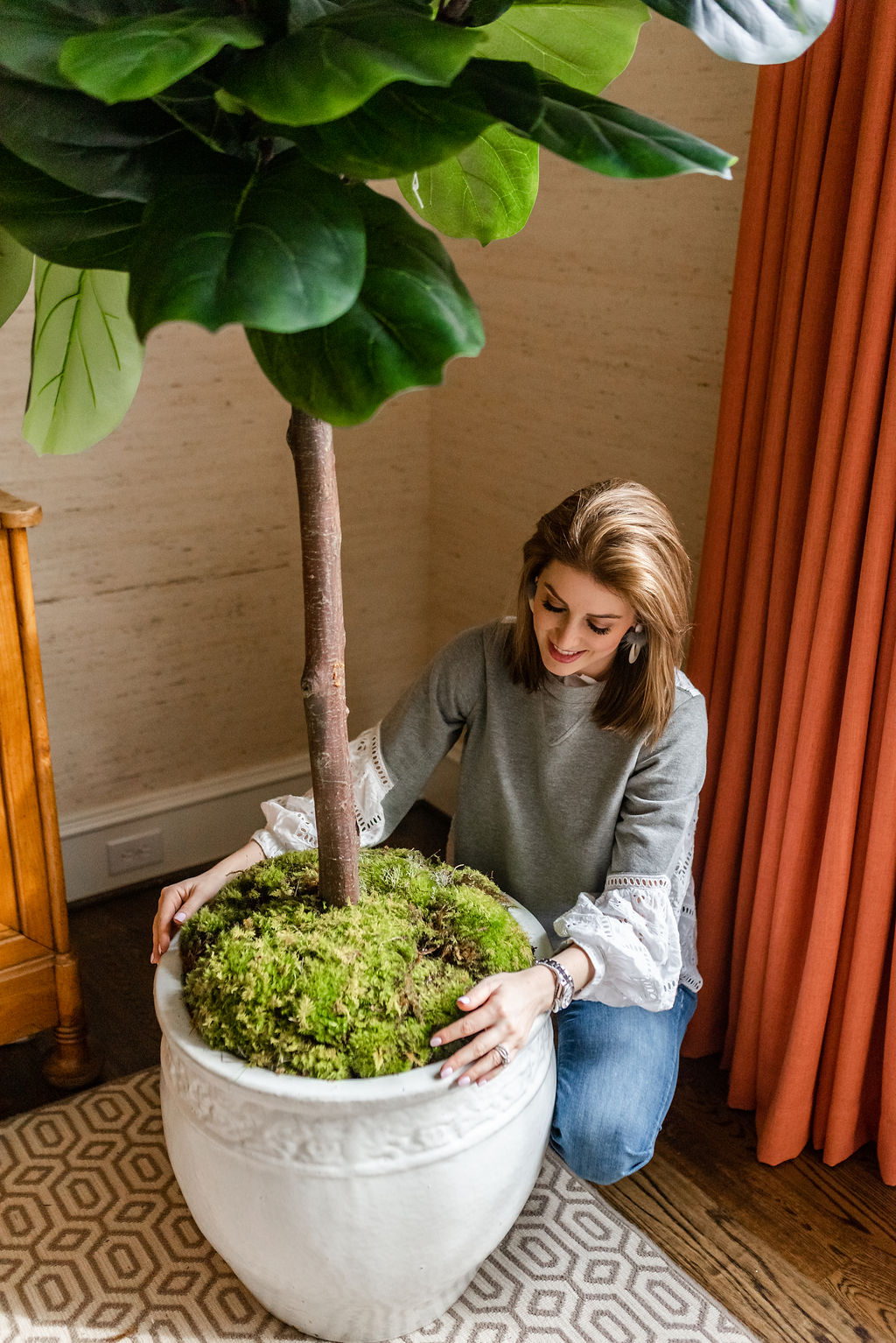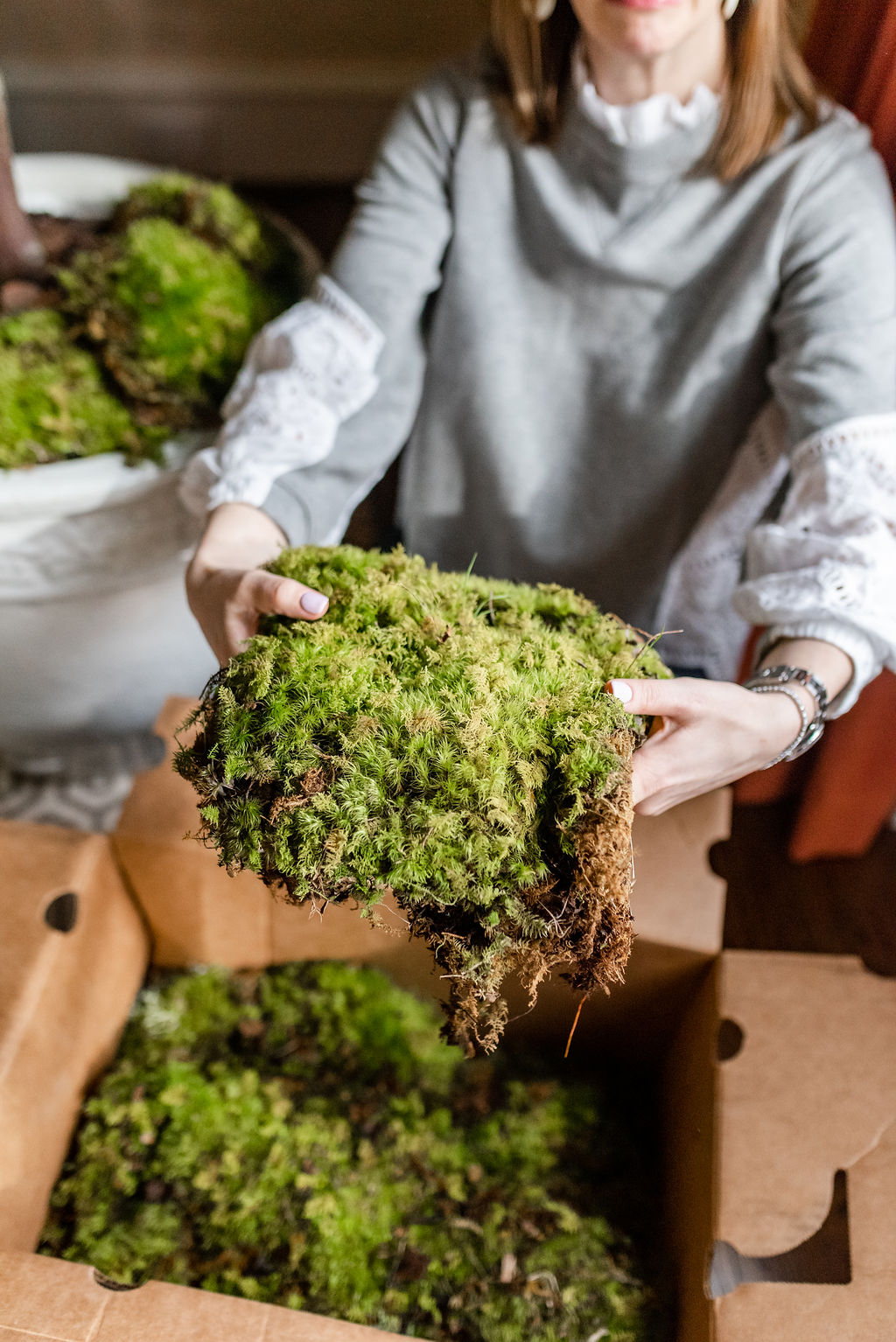 My faux fig tree has been sitting in an empty pot for about a year. I decided it was finally time to style it with some live moss. I purchased my box of moss for about $35 at my local wholesale flower market. If you don’t have access to a wholesale market, get your local florist to grab you a box. I’ve also been on hikes before where I’ve seen luscious patches of moss, so you can also gather it fresh if you see it! This could be an excellent treasure hunt activity during quarantine 😉 This can be done on any house plant, real or fake. This is especially pretty with a bedside fern or a potted hydrangea on your counter. Here are the steps on how to style your moss:
