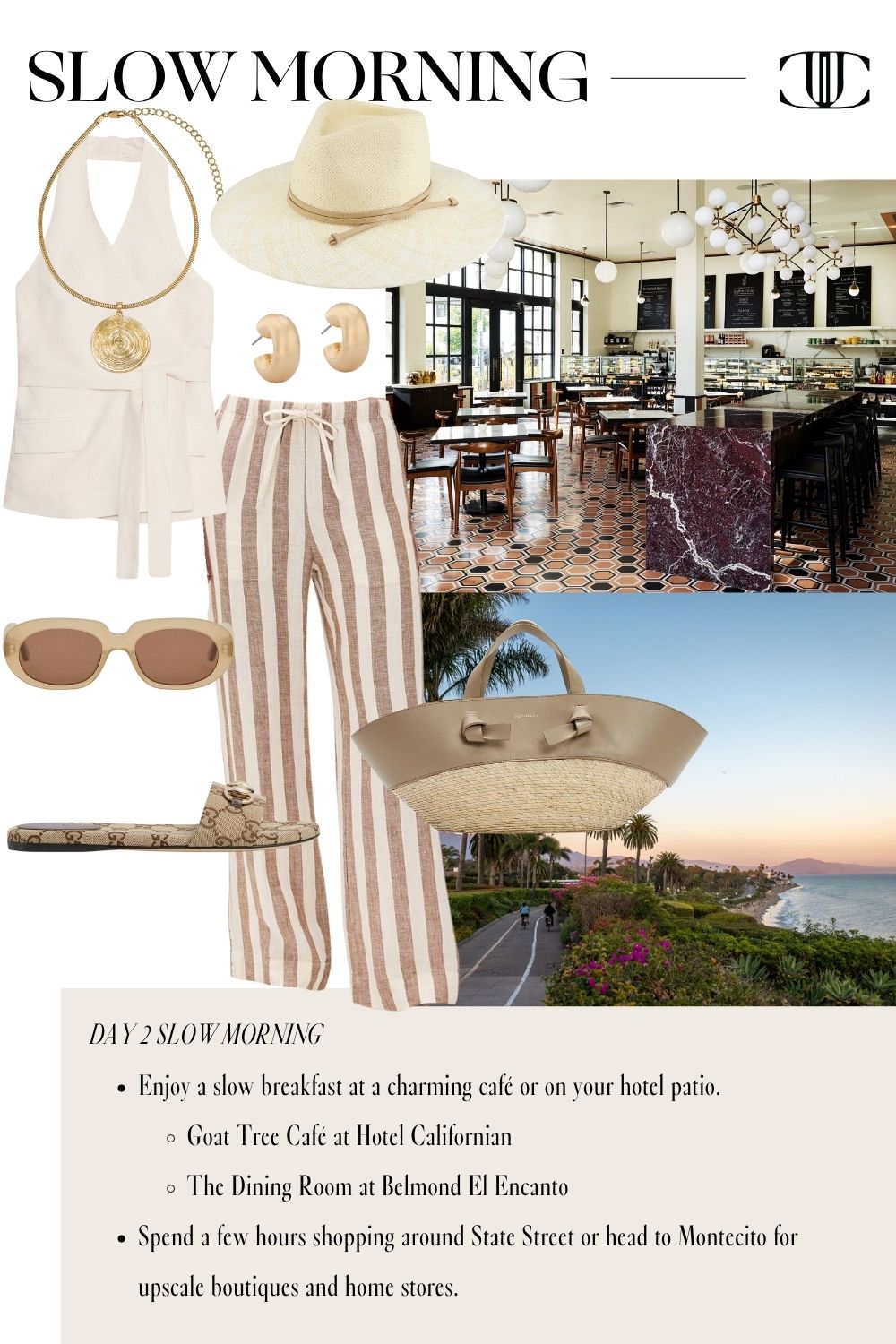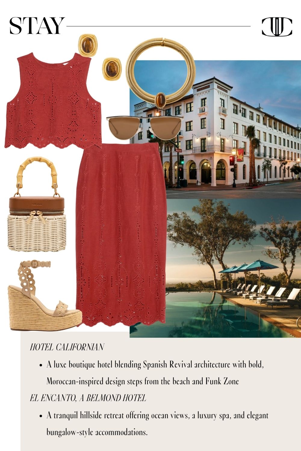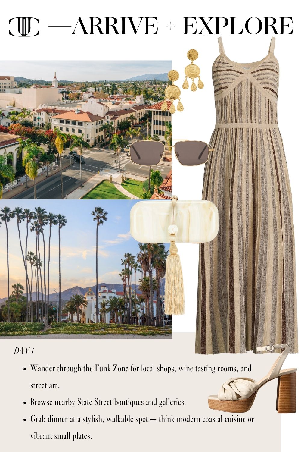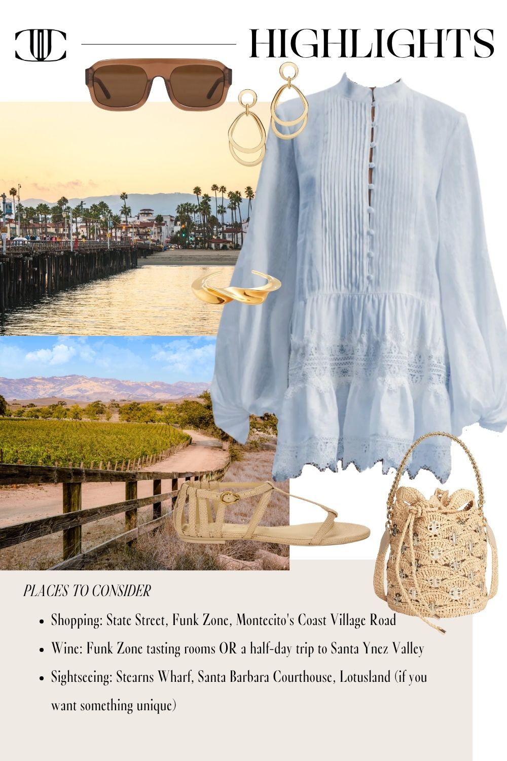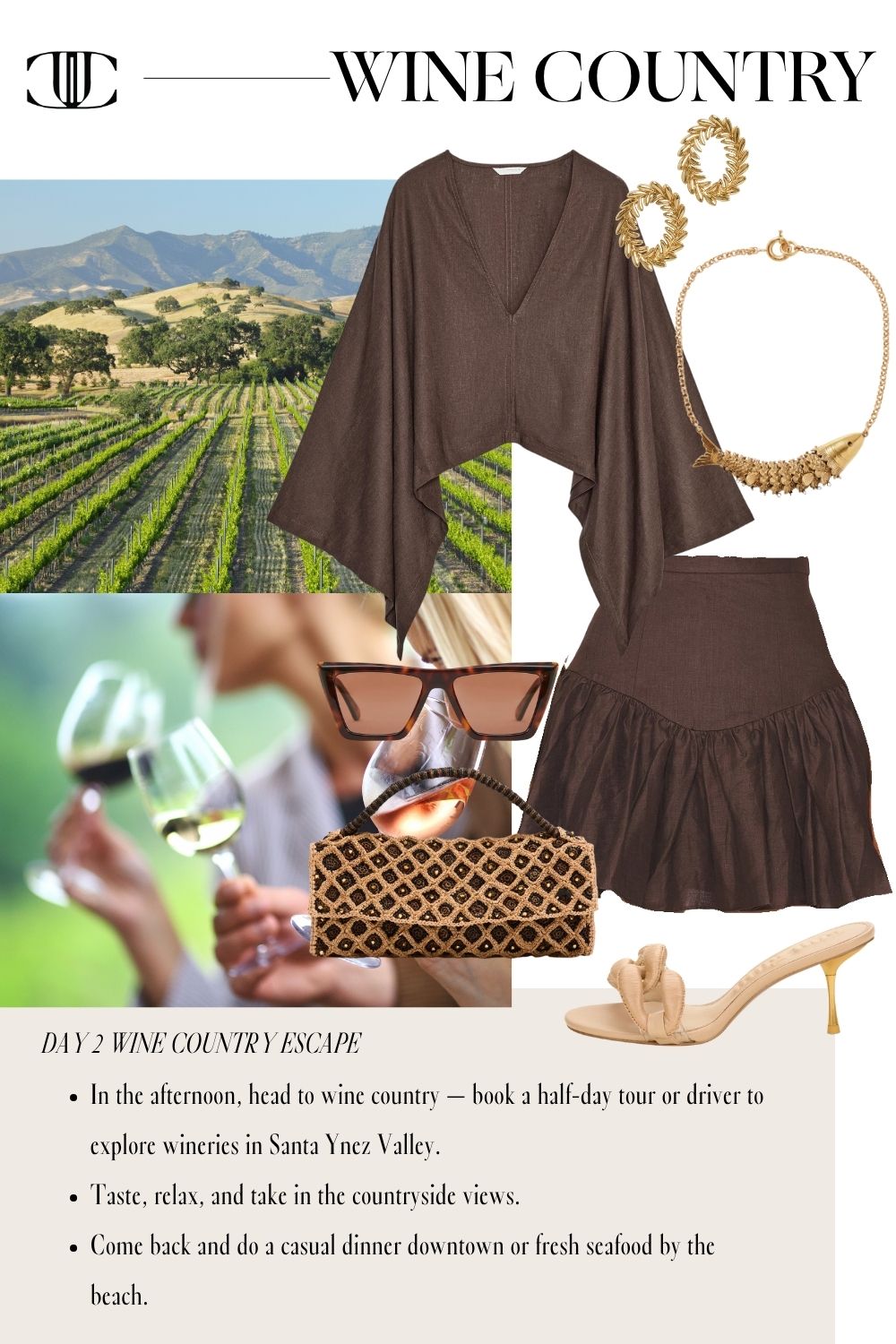 This guide includes six fully styled, head-to-toe looks to carry you from morning lattes to golden hour cocktails. We’re talking breezy dresses for wine country tastings, polished sets perfect for boutique hopping, and casual-cool layers for beachside brunches. Plus, you’ll find recommendations on where to stay, what to eat, and where to shop—so you can focus on making memories in style.