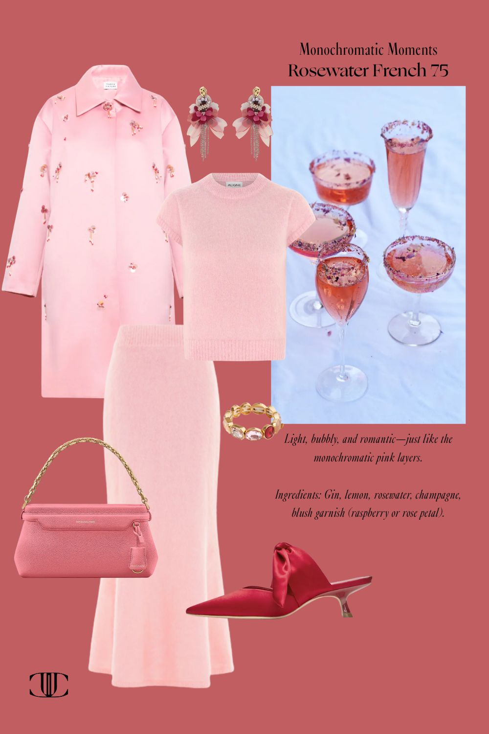 The rosewater French 75 look explores soft blush and pink tones styled in a refined monochromatic palette. This look feels romantic, elegant, and feminine while still maintaining structure and polish. Tonal pink dressing is timeless and flattering, making this outfit perfect for celebrations, daytime events, or elevated casual moments where you want to feel put together without feeling overdone.