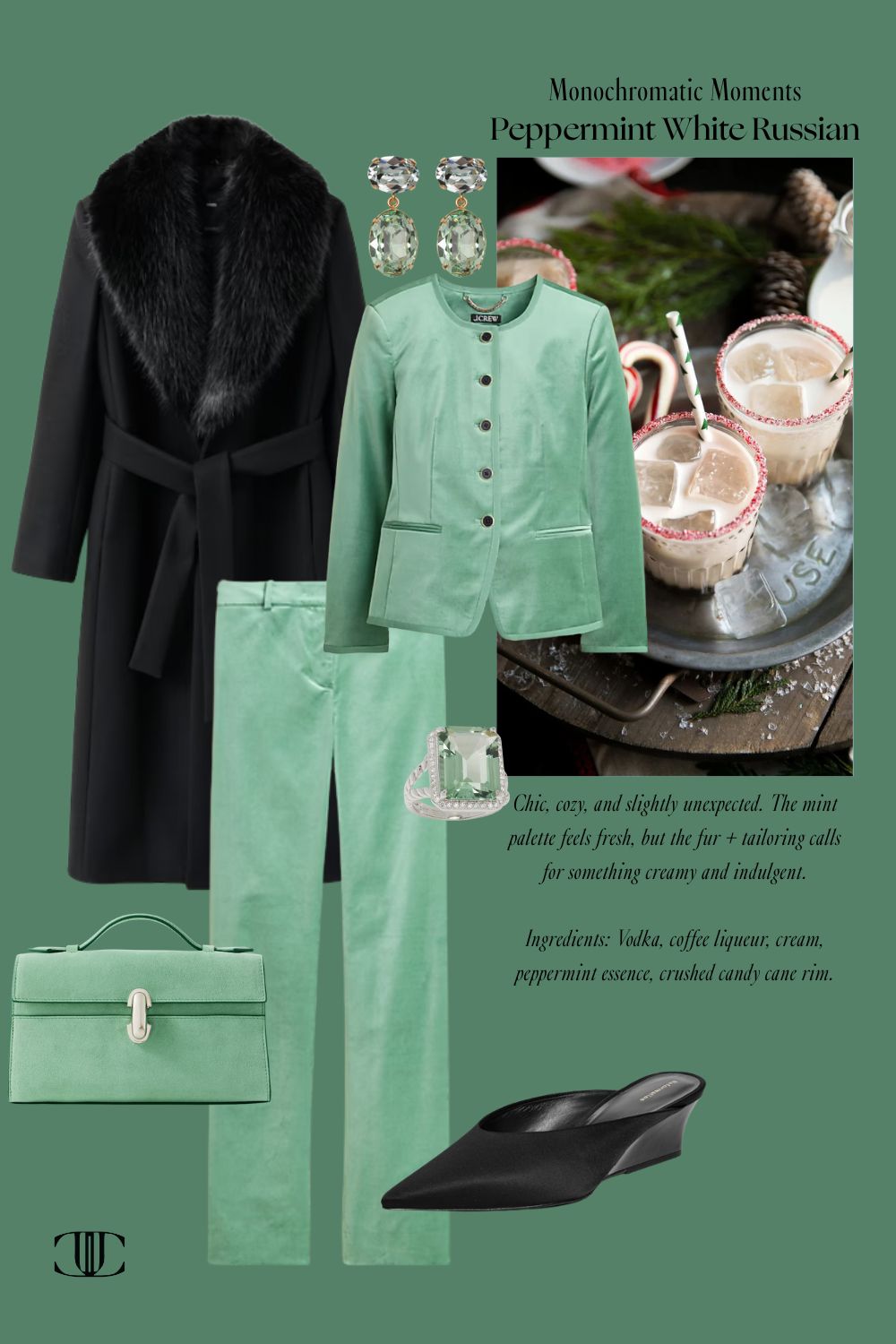 The peppermint white Russian look leans into soft contrast and winter texture. Shades of crisp white, ivory, and black are layered together to create a fresh, modern monochromatic outfit that feels chic without being stark. Mixing tailored pieces with softer knits adds depth while keeping the palette cohesive. This is an ideal winter look for daytime events, holiday gatherings, or polished errands where you want to look pulled together but effortless.