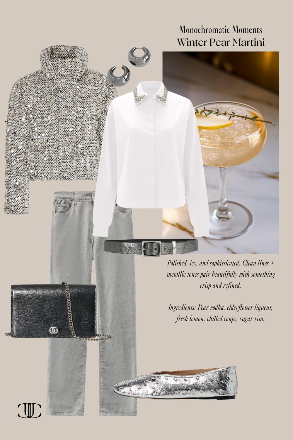 The winter pear martini look plays with warm neutrals and soft grays for a refined, understated monochromatic outfit. Cozy textures paired with clean tailoring make this look feel both sophisticated and approachable. This tonal palette works beautifully for travel days, workwear transitions, or casual dinners, offering an easy formula for looking elevated without overthinking your outfit.