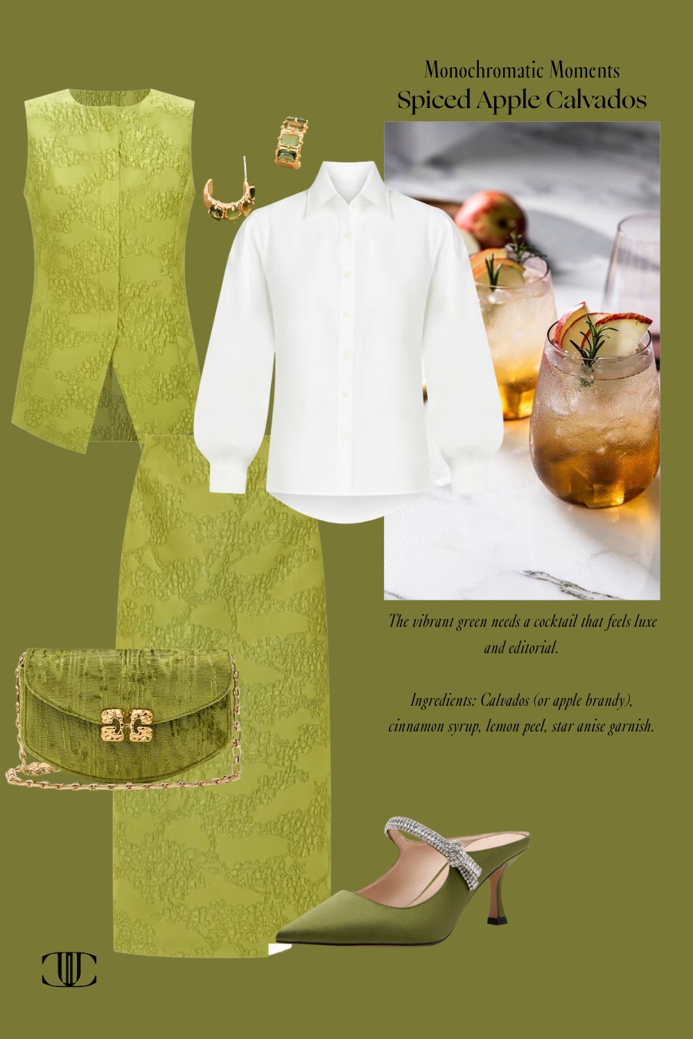 The spiced apple calvados look leans into rich green tones layered with soft structure and elegant accessories. This monochromatic green outfit feels grounded and seasonal, making it ideal for fall and winter dressing. Tonal greens are flattering across skin tones and offer a refreshing alternative to traditional neutrals while still feeling timeless and versatile.