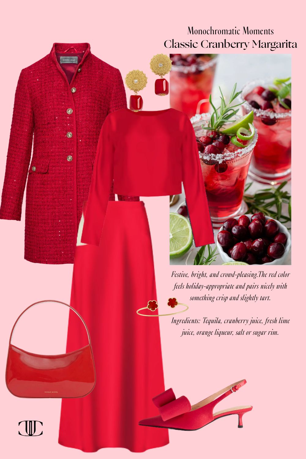 The classic cranberry margarita look is a bold red monochromatic outfit that feels festive, confident, and statement-making. Layering different shades of red adds depth and sophistication while maintaining a cohesive look. This outfit is ideal for holiday parties, special occasions, or anytime you want your outfit to feel powerful and unforgettable.