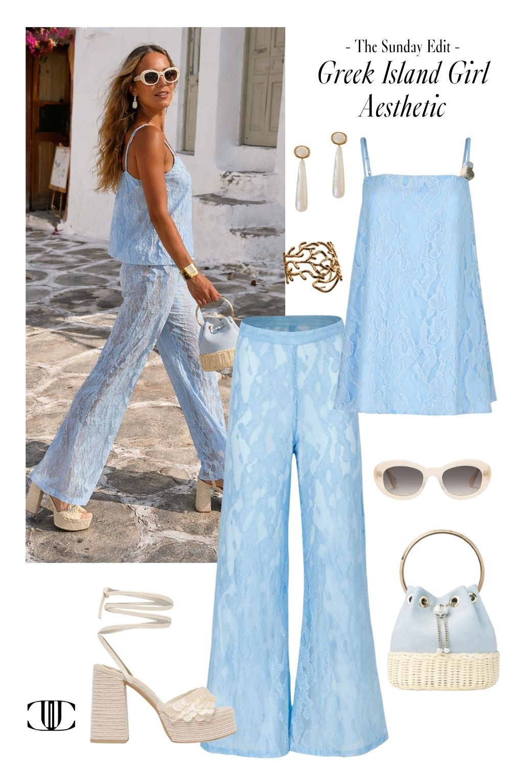 In this edit, I’ve styled eight head-to-toe outfits that capture that easy rhythm—swim, daytime pieces, and elevated looks for night. Think light fabrics, soft neutrals, touches of blue, and silhouettes that feel relaxed but still pulled together.