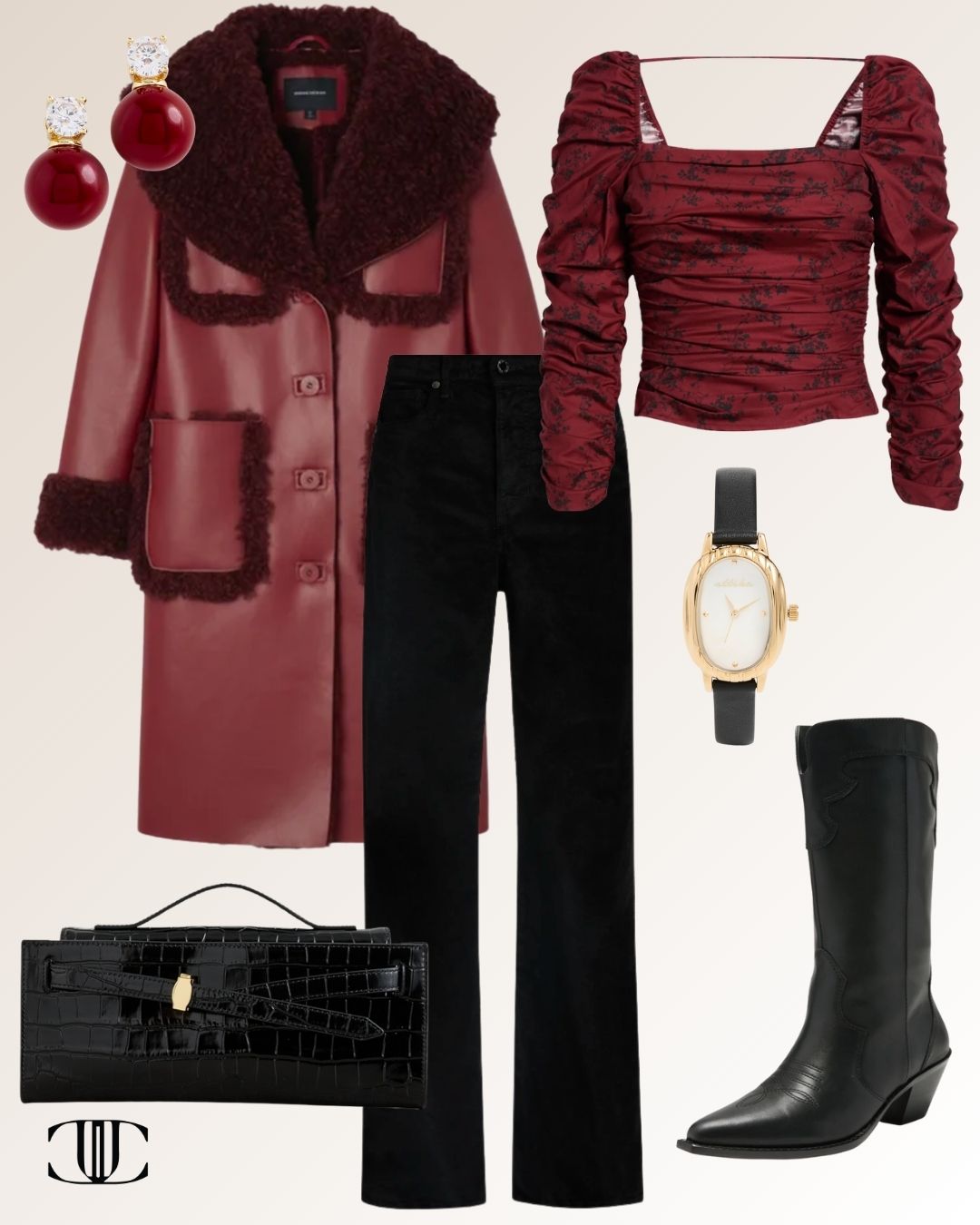 Coat, Top, Bottom, Shoes, Bag, Earrings, Watch
