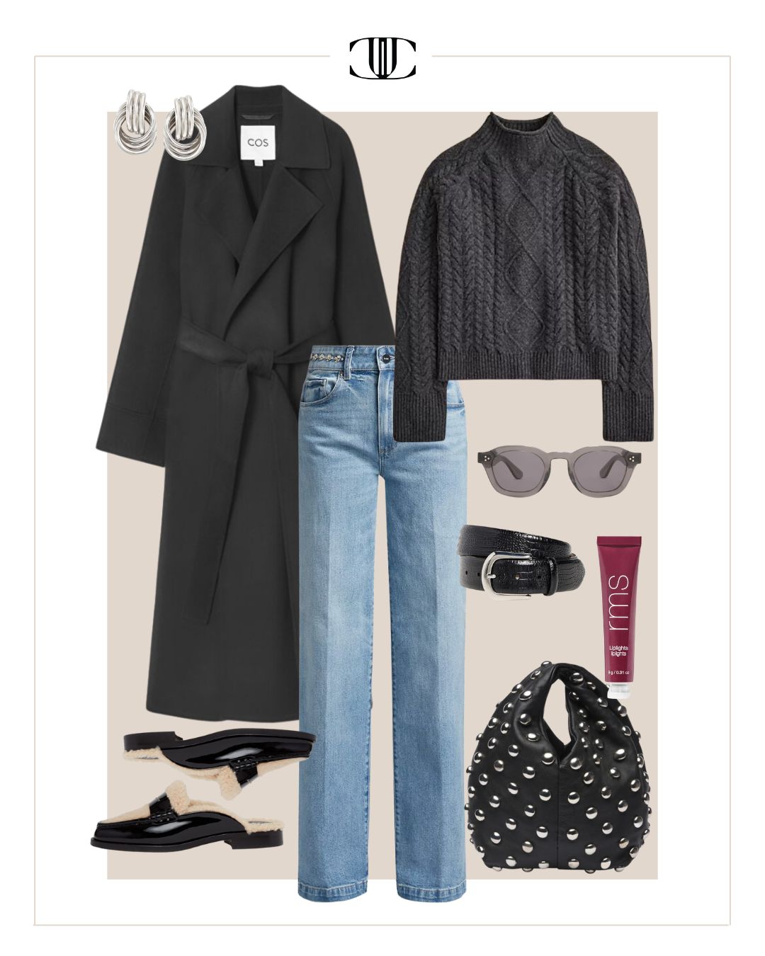 Coat, Top, Bottom, Belt, Shoes, Bag, Earrings, Sunglasses, Gloss