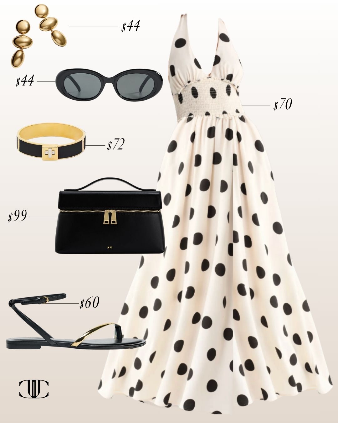 Dress, Shoes, Bag, Earrings, Bracelet, Sunglasses