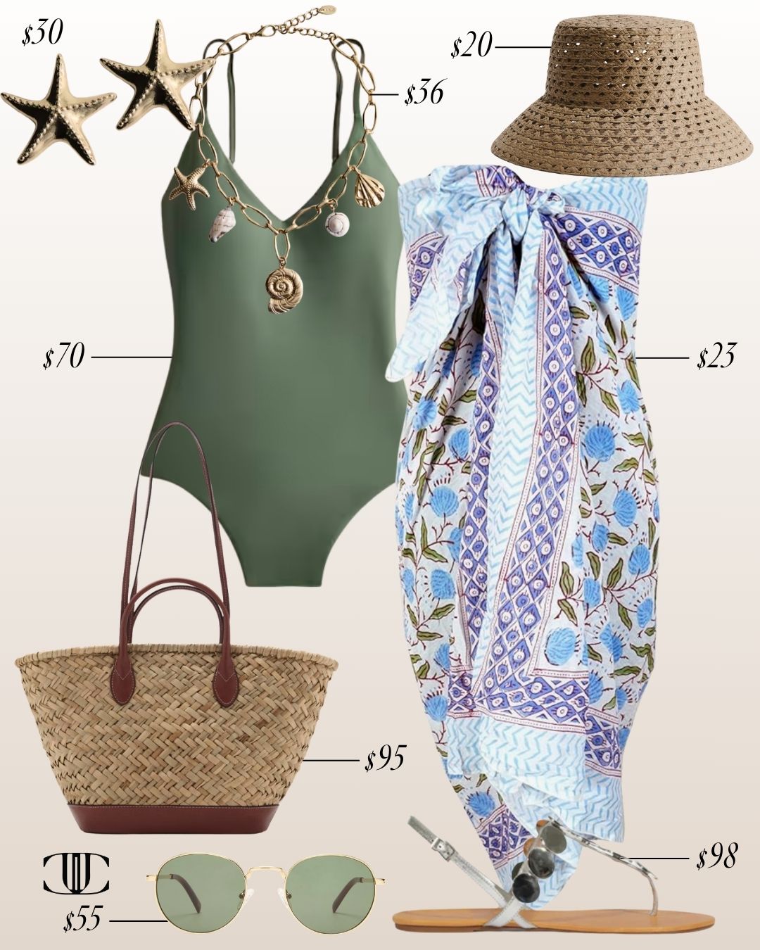 Swimsuit, Cover Up, Shoes, Bag, Earrings, Necklace, Sunglasses, Hat