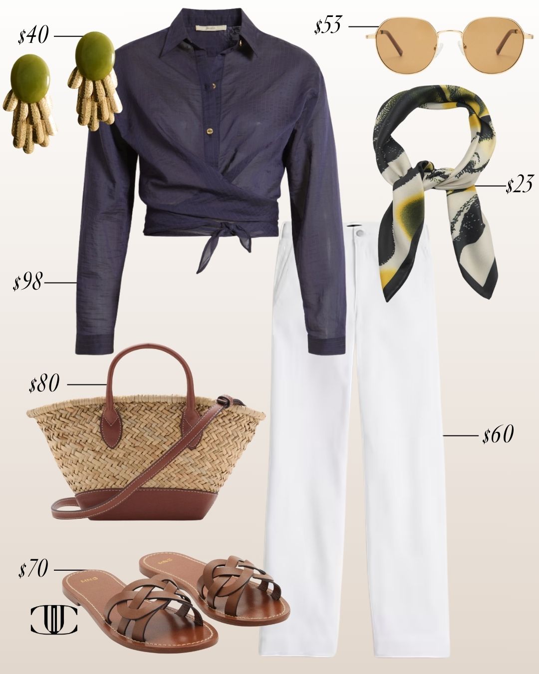 Top, Bottom, Shoes, Bag, Earrings, Sunglasses, Scarf