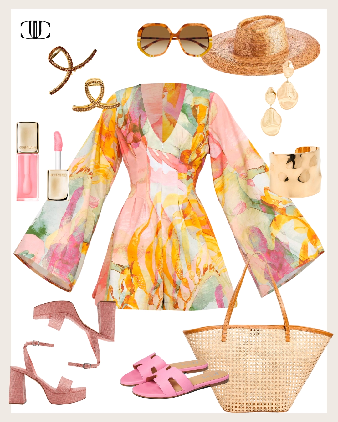 Romper, Sandals, Earrings, Bracelet, Bag, Sunglasses, Hair Clips, Lip, Hat, Heels