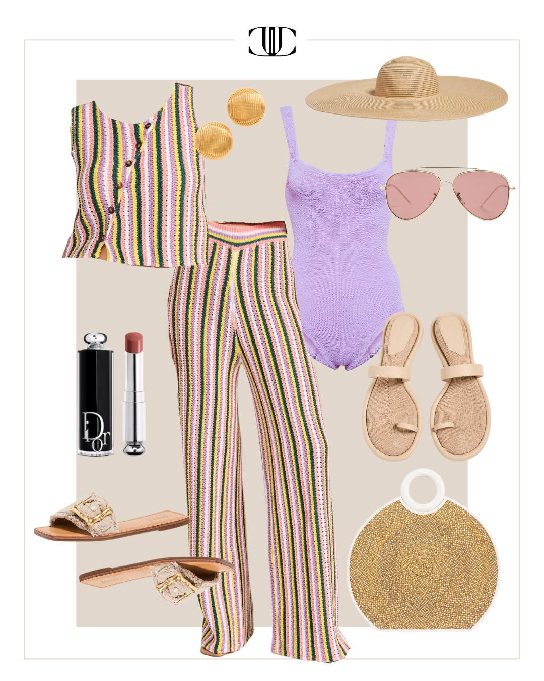 Top, Pants, Swimsuit, Hat, Earrings, Buckle sandals, Strappy Sandals, Bag, Sunnies, Lip