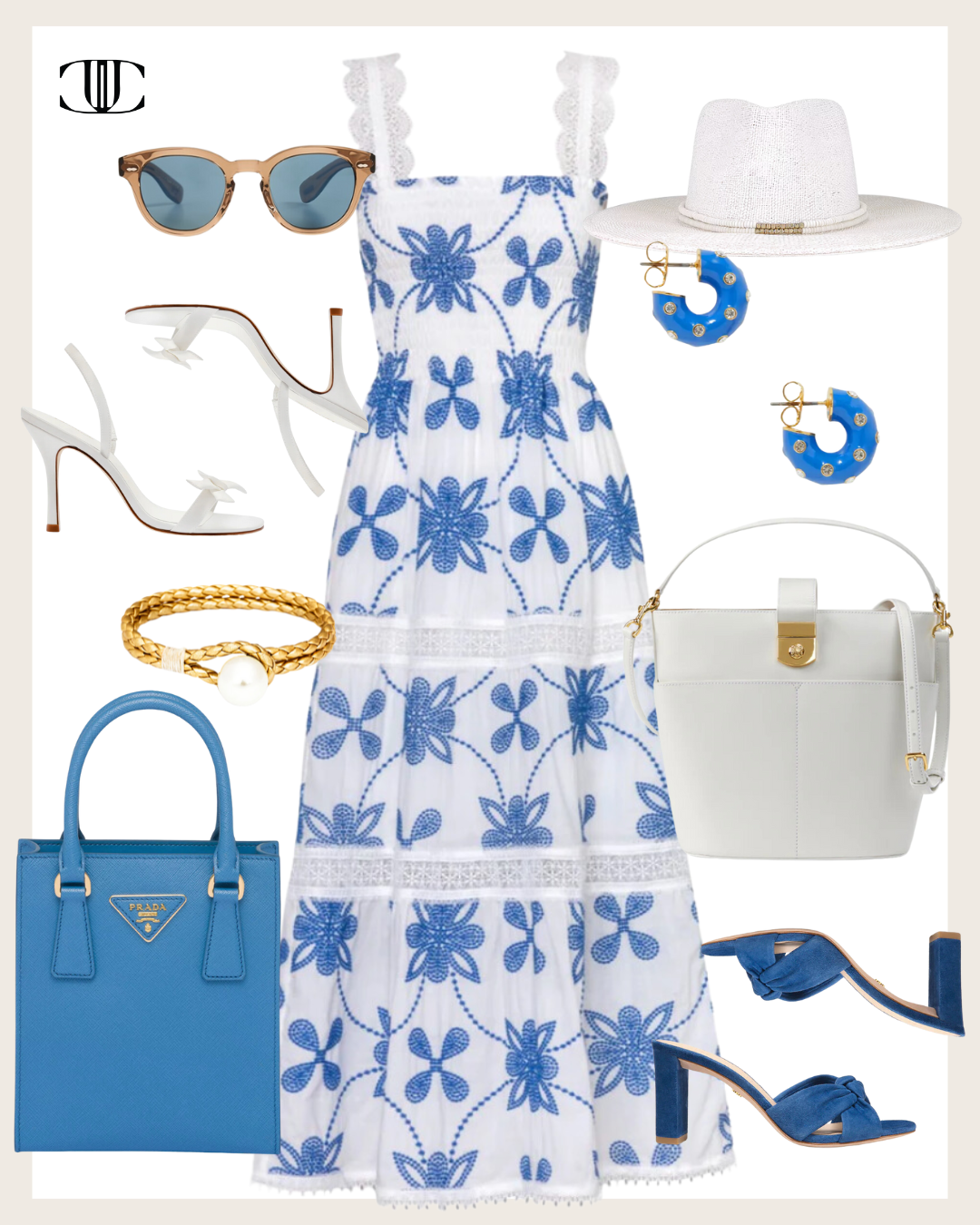 Dress, Earrings, Bracelet, Hat, White sandal, Blue sandal, White bag, Blue bag, Sunnies