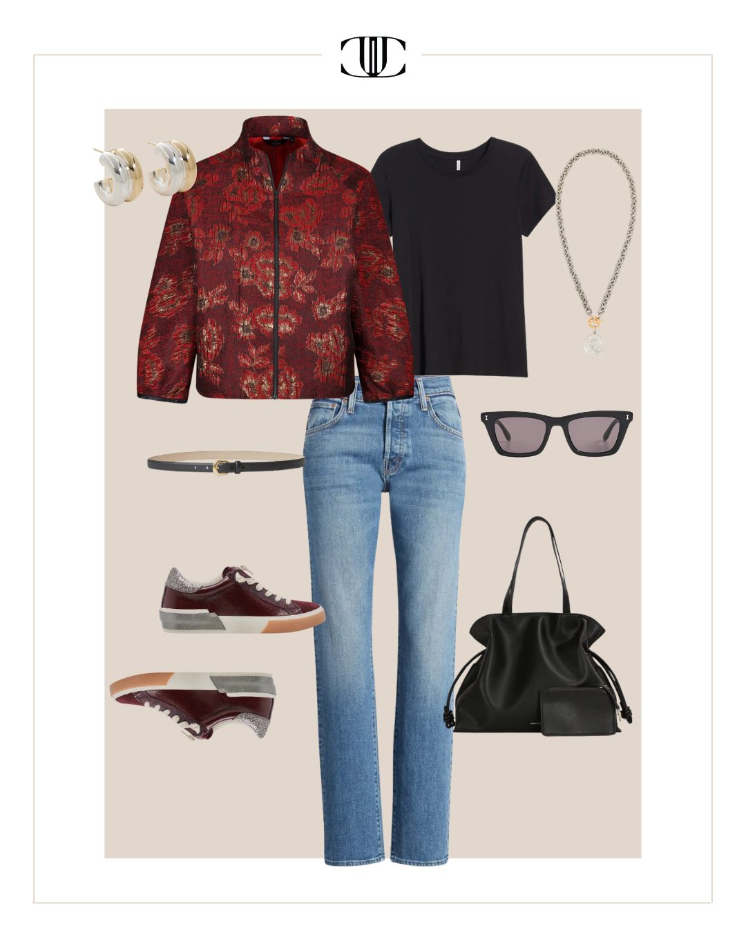 Jacket, Top, Bottom, Belt, Shoes, Bag, Earrings, Necklace, Sunglasses