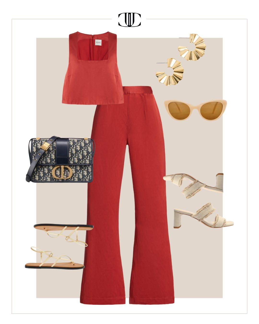 Top, Pants, Bag, Sunglasses, Earrings, Shoe 1, Shoe 2