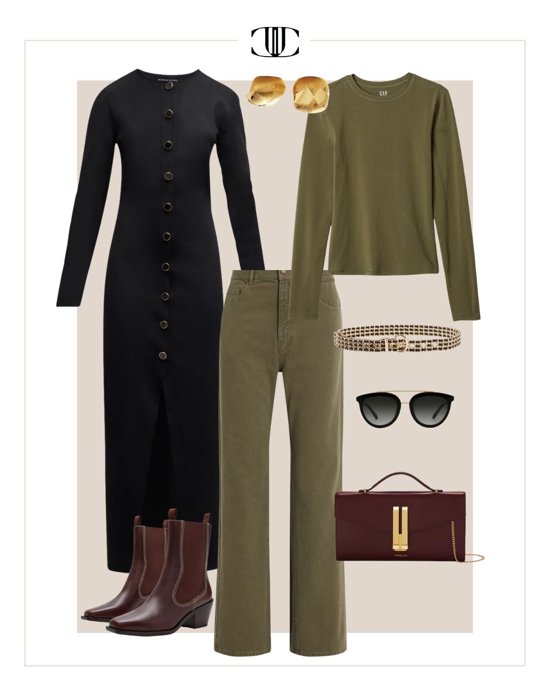 Cardigan, Top, Bottom, Belt, Shoes, Bag, Earrings, Sunglasses