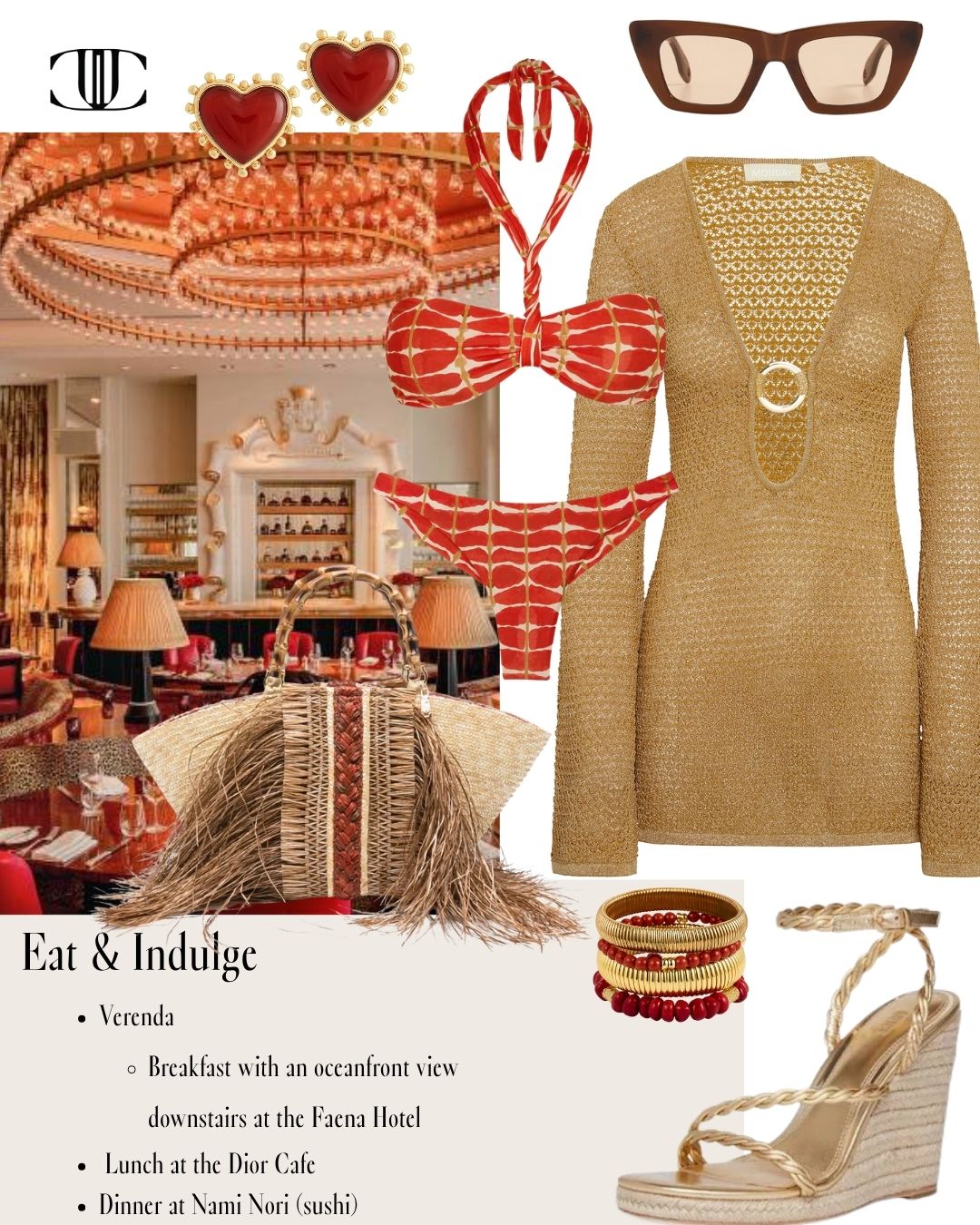 Swimsuit Top, Swimsuit Bottom, Cover Up, Shoes, Bag, Earrings, Bracelet, Sunglasses
