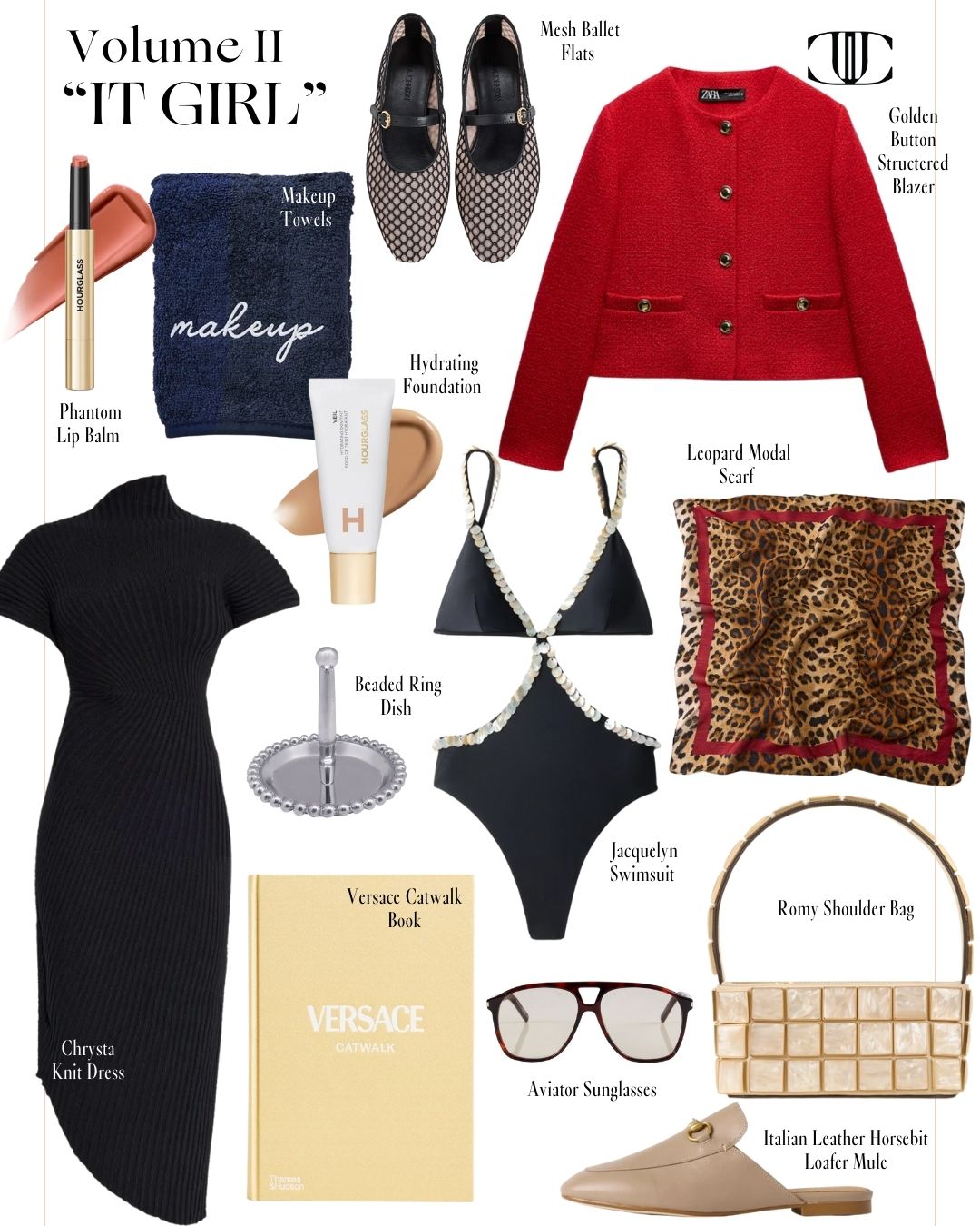 Sunglasses, Mesh Flats, Makeup Towel, Scarf, Swimsuit, Skin Tint Foundation, Blazer, Ring Dish, Loafers, Knit Dress, Bag, Lip Balm, Book