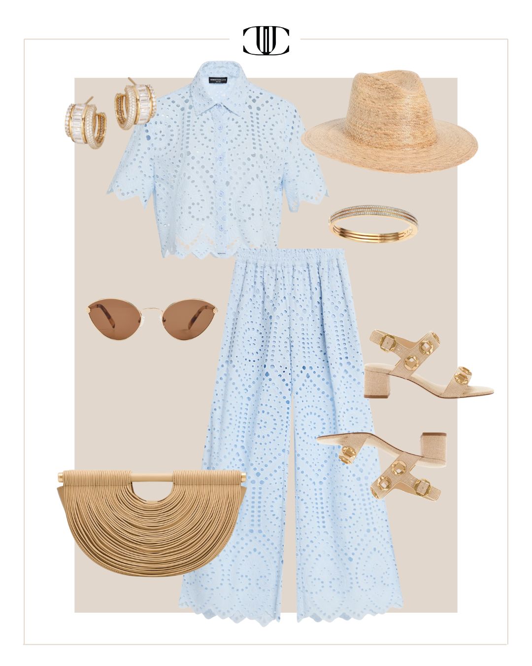 Top, Bottom, Shoes, Bag, Earrings, Bracelet, Sunglasses, Hat