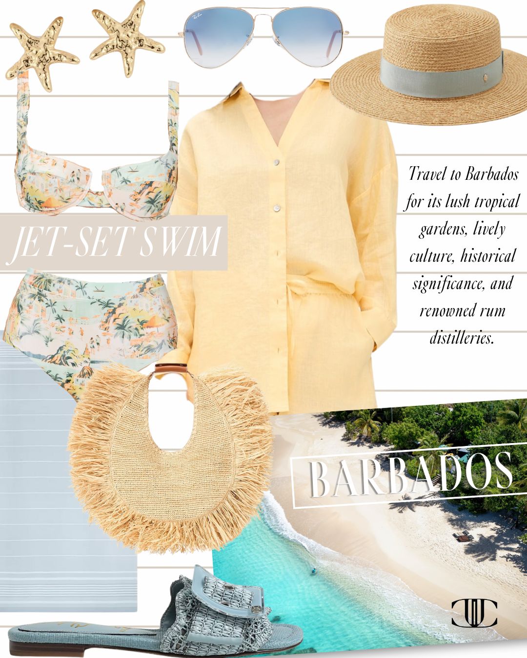 Swimsuit Top, Swimsuit Bottom, Tunic, Shorts, Shoes, Bag, Earrings, Sunglasses, Hat, Towel