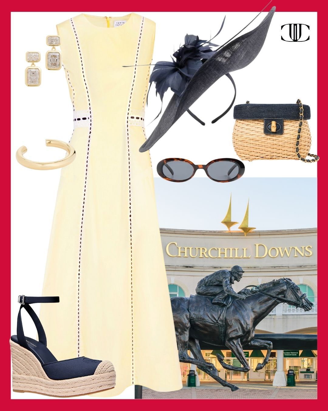 Dress, Shoe, Bag, Earrings, Bracelet, Sunglasses, Fascinator