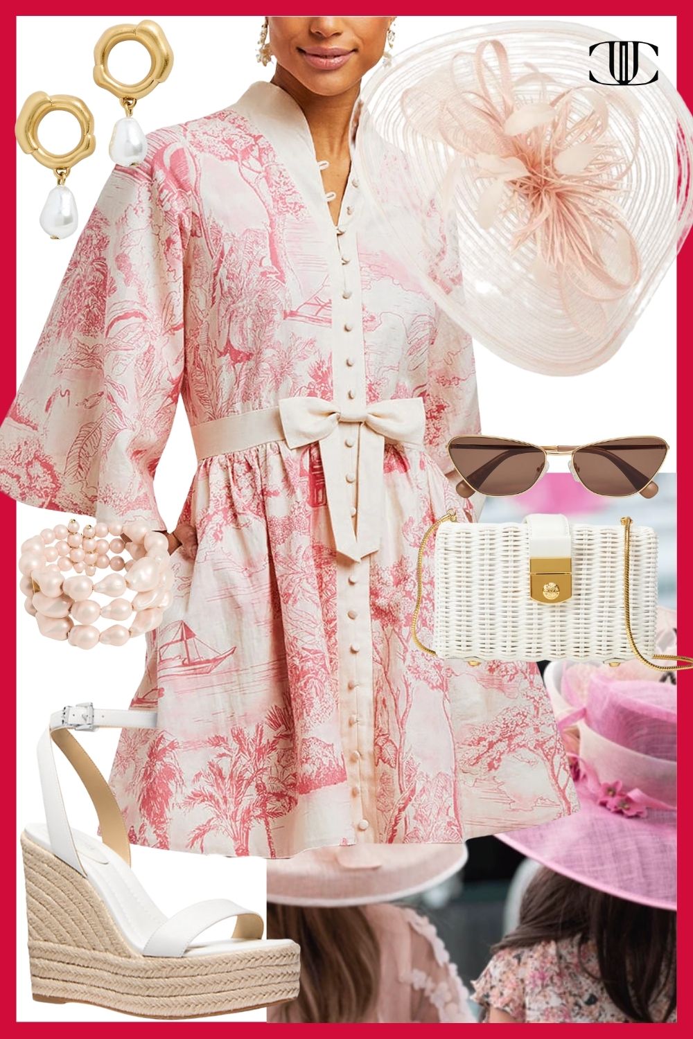 Dress, Shoes, Bag, Earrings, Bracelet, Sunglasses, Fascinator