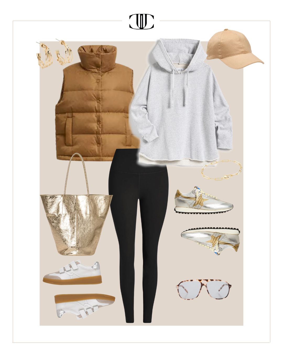 Vest, Top, Bottom, Shoe, Shoe, Bag, Earrings, Bracelet, Sunglasses, Hat
