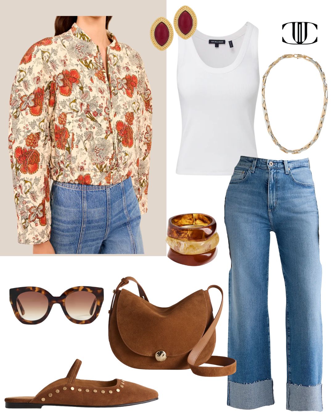 Jacket, Top, Bottom, Shoes, Bag, Earrings, Necklace, Bangles, Sunglasses