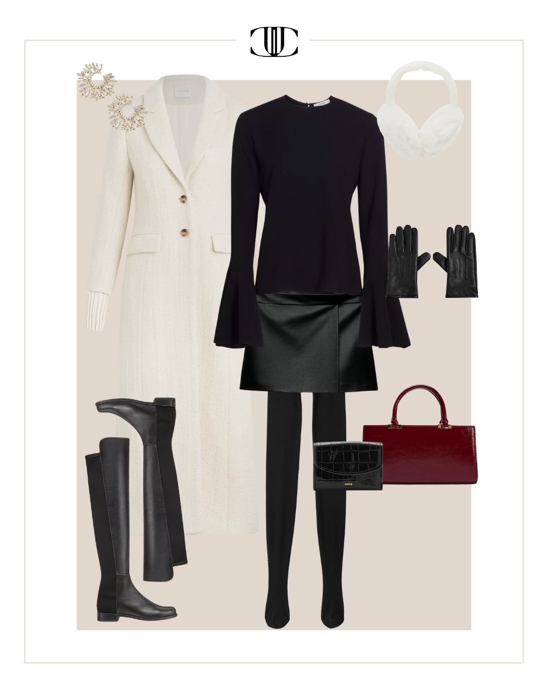 top, coat, skort, gloves, tights, boots, bag, earmuffs, bag, earrings