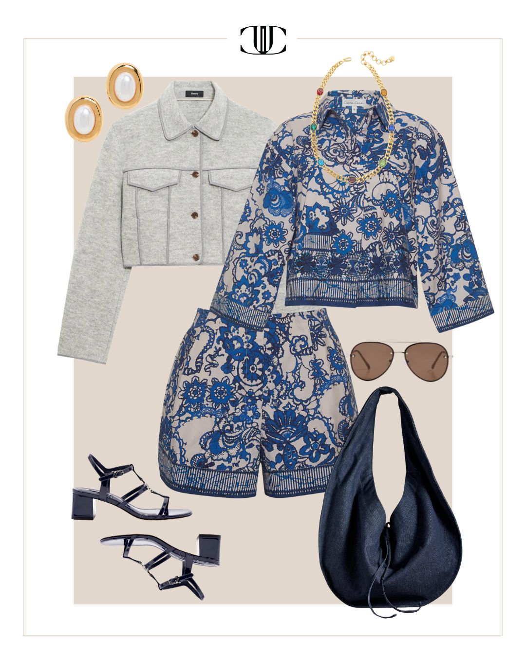 Jacket, Top, Bottom, Shoes, Bag, Earrings, Necklace, Sunglasses