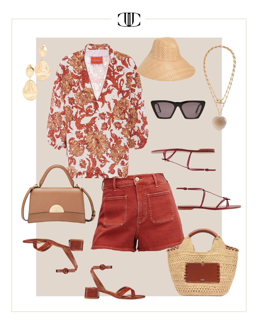 Hat, Top, Shorts, Shoe 1, Shoe 2, Bag 1, Bag 2, Earrings, Necklace, Sunglasses