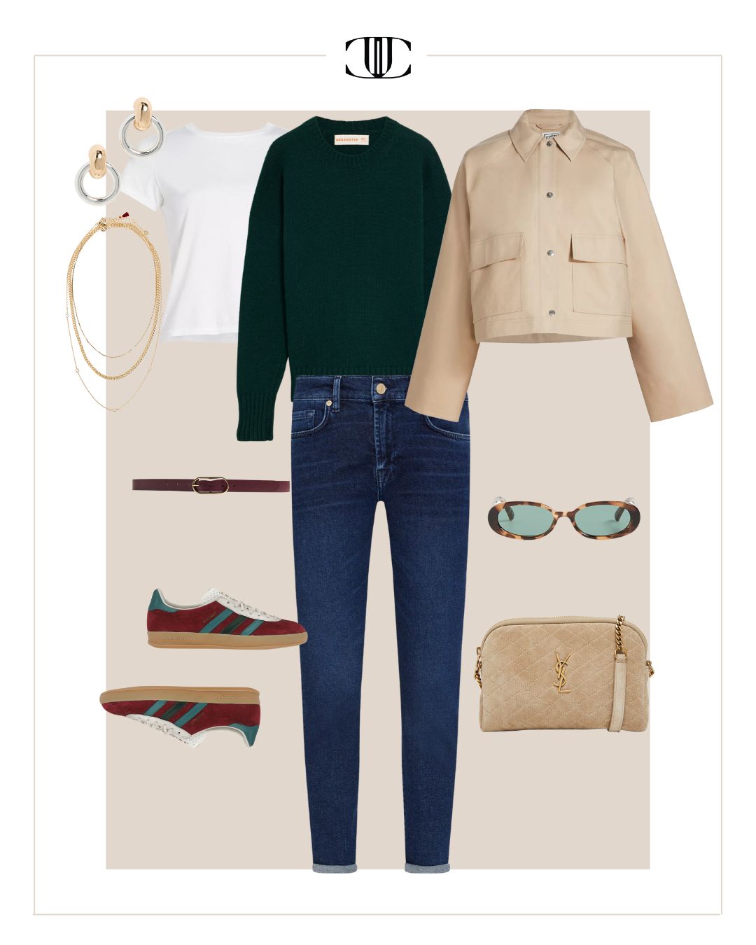 Bottom, Top, Sweater, Jacket, Shoe, Bag, Belt, Earrings, Necklace, Sunglasses