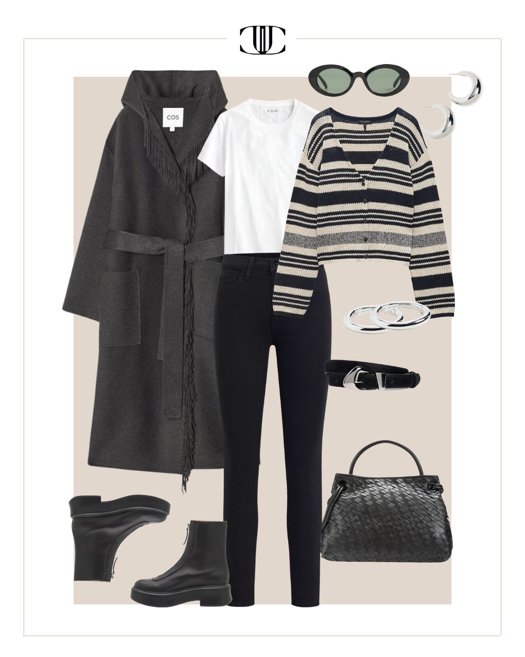 Coat, Shoe, Pant, Top, Sweater, Belt, Bag, Earrings, Bracelet, Sunglasses