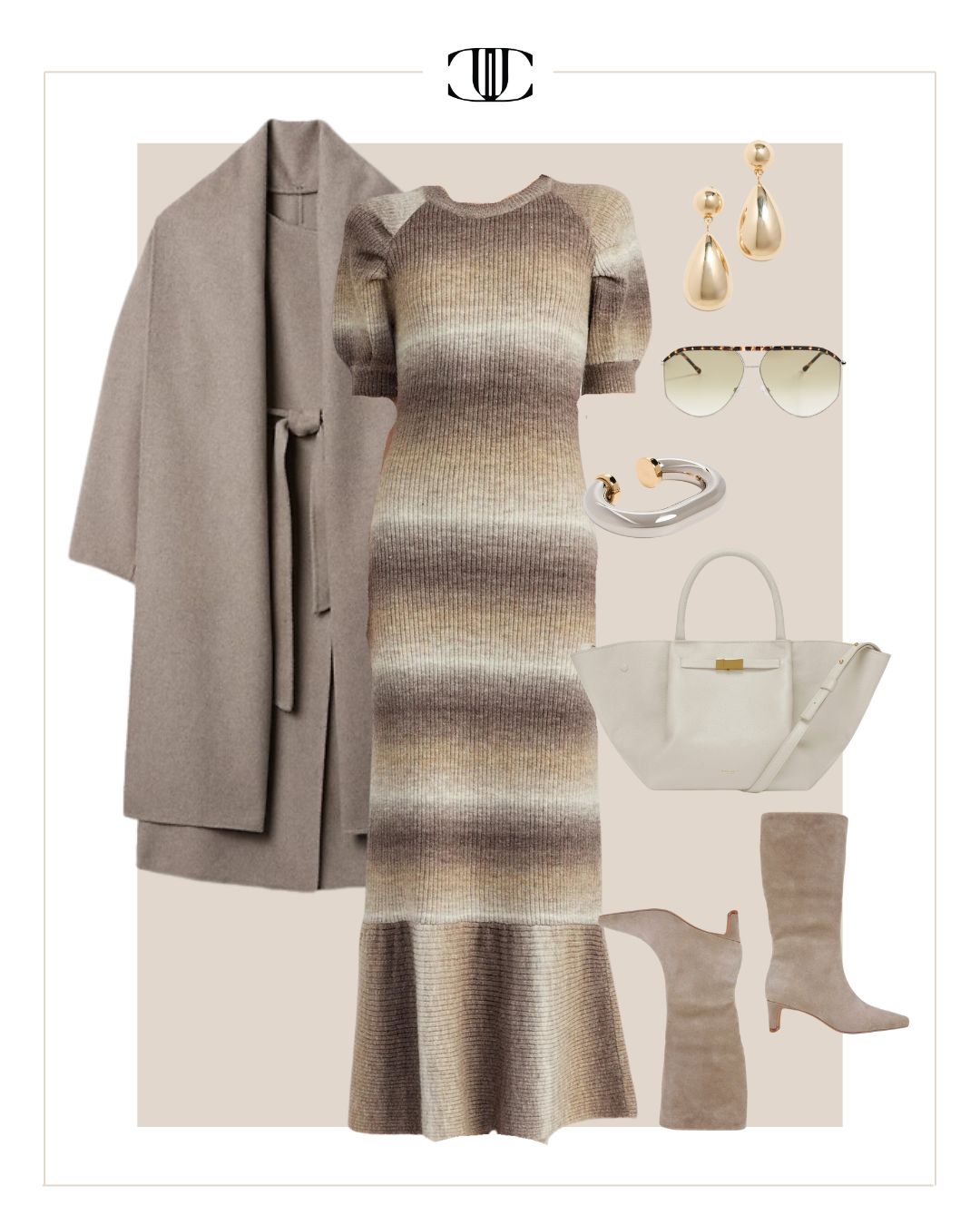 Dress, Coat, Shoe, Bag, Earrings, Bracelet, Sunglasses