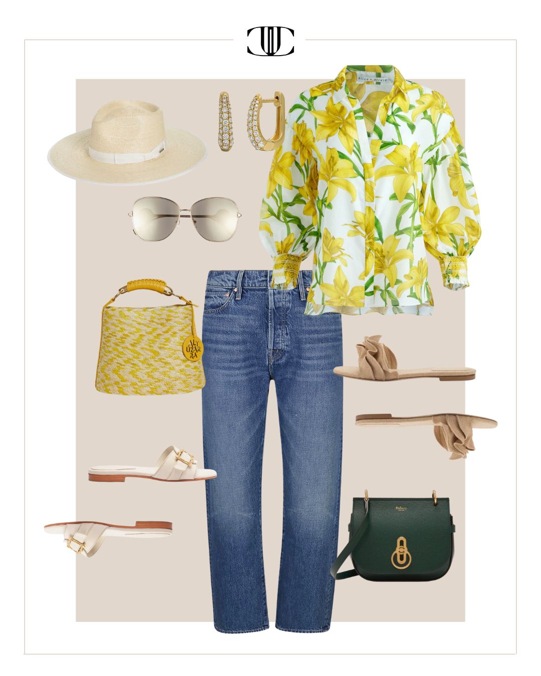 Jeans, Top, White Shoe, Brown Shoe, Yellow Bag, Green Bag, Earrings, Sunglasses, Hat
