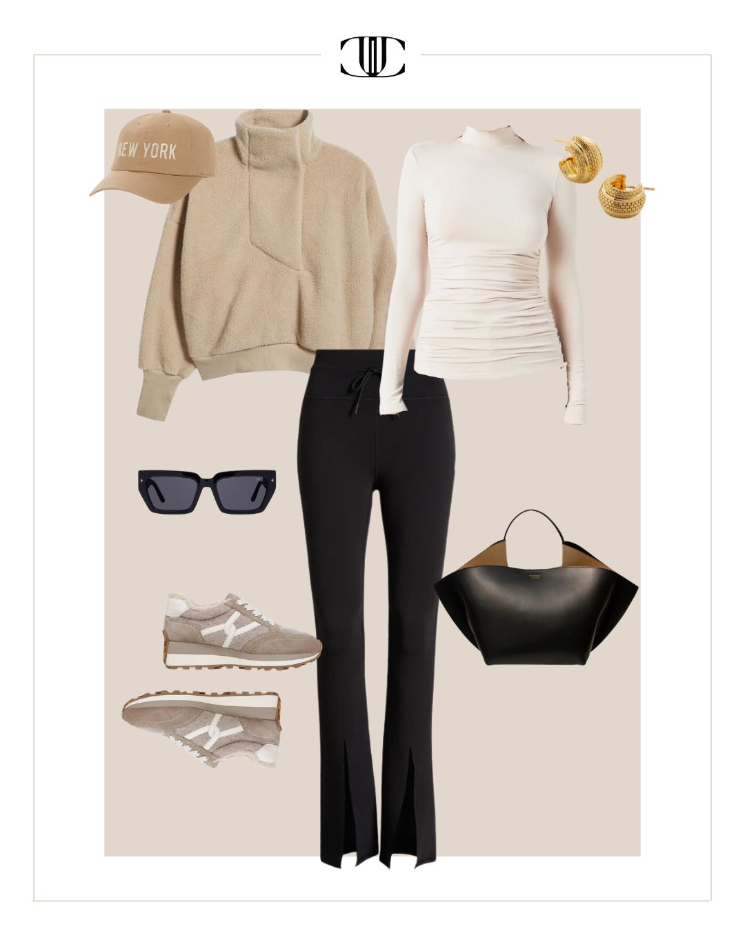 Jacket, Top, Bottom, Shoes, Bag, Earrings, Sunglasses, Hat