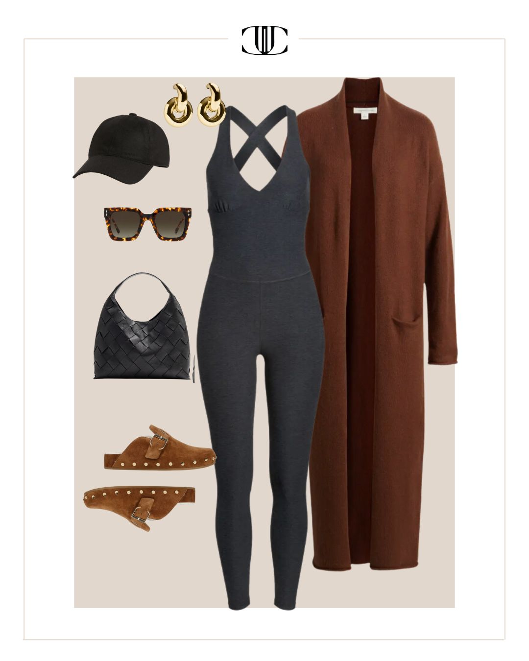 Sweater, Jumpsuit, Shoes, Bag, Earrings, Sunglasses, Hat