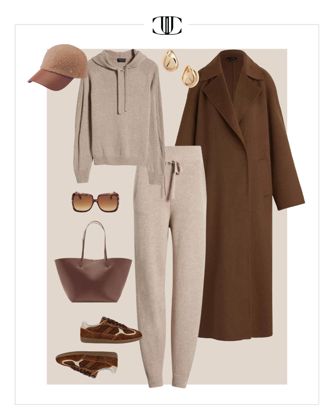 Coat, Top, Bottom, Shoes, Bag, Earrings, Sunglasses, Hat