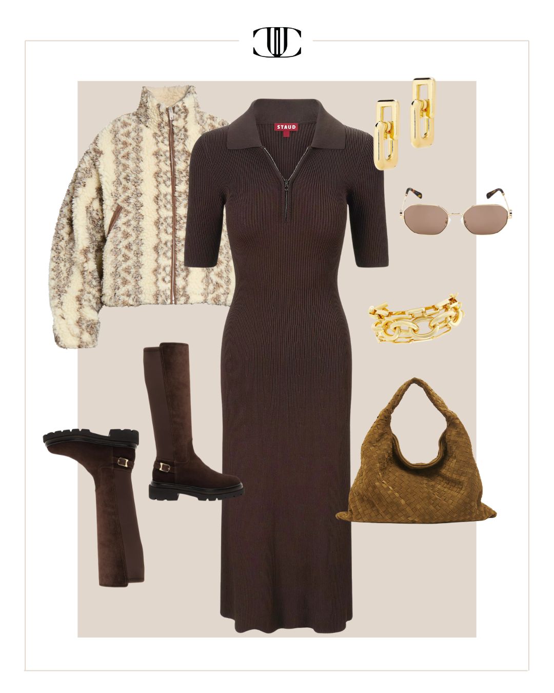 Jacket, Dress, Shoe, Bag, Earrings, Bracelet, Sunglasses