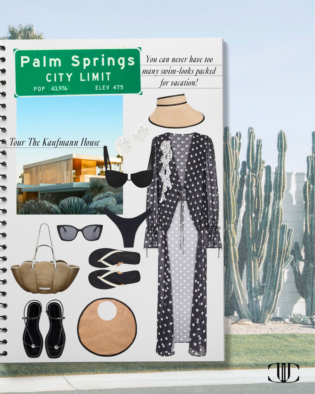 Cover Up, Swimsuit Top, Swimsuit Bottom, Shoes, Shoes, Bag, Bag, Earrings, Necklace, Sunglasses, Hat