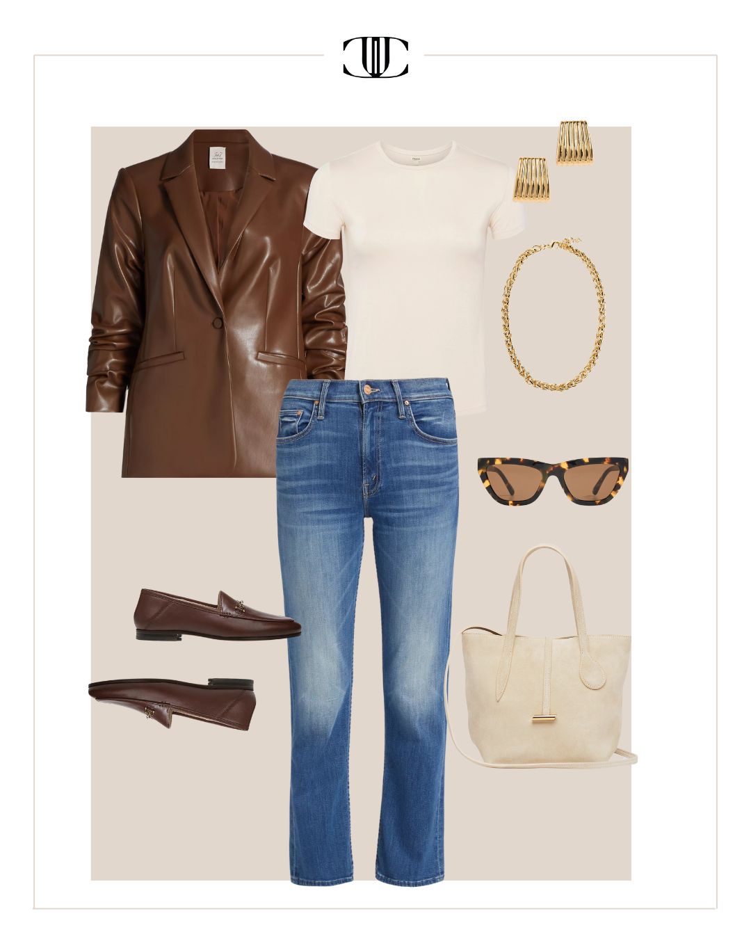 Jacket, Top, Bottom, Shoes, Bag, Earrings, Necklace, Sunglasses