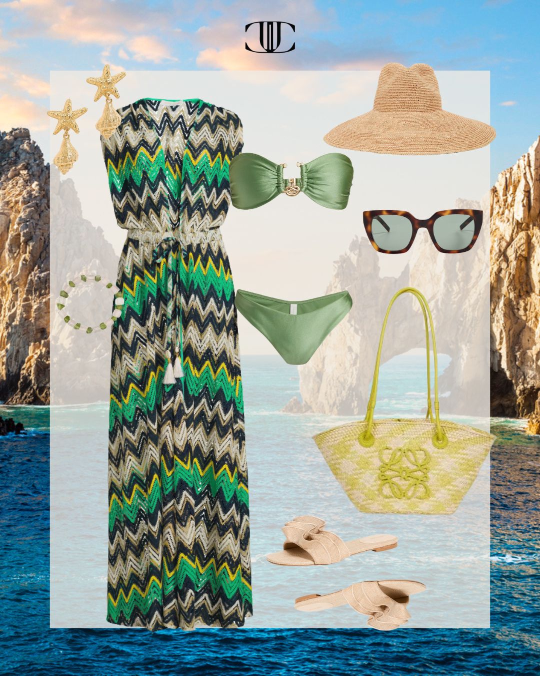 Cover Up, Swimsuit, Shoes, Bag, Earrings, Bracelet, Sunglasses, Hat