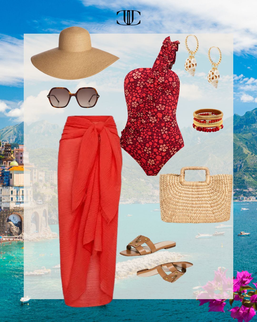Swimsuit, Cover Up, Shoes, Bag, Earrings, Bracelet, Sunglasses, Hat