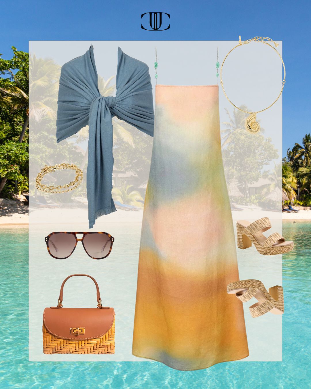 Wrap, Dress, Shoes, Bag, Necklace, Bracelet, Sunglasses