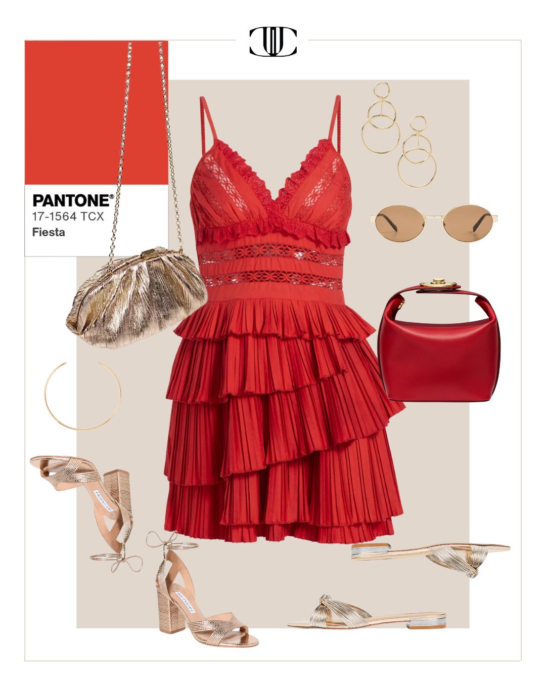 Dress, Heels, Sandals, Gold Bag, Red Bag, Earrings, Necklace, Sunglasses