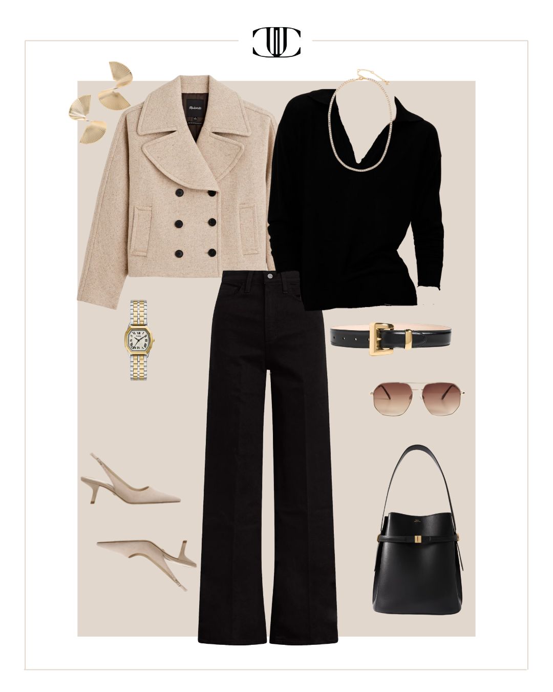 Coat, Top, Bottom, Belt, Shoes, Bag, Earrings, Necklace, Watch, Sunglasses
