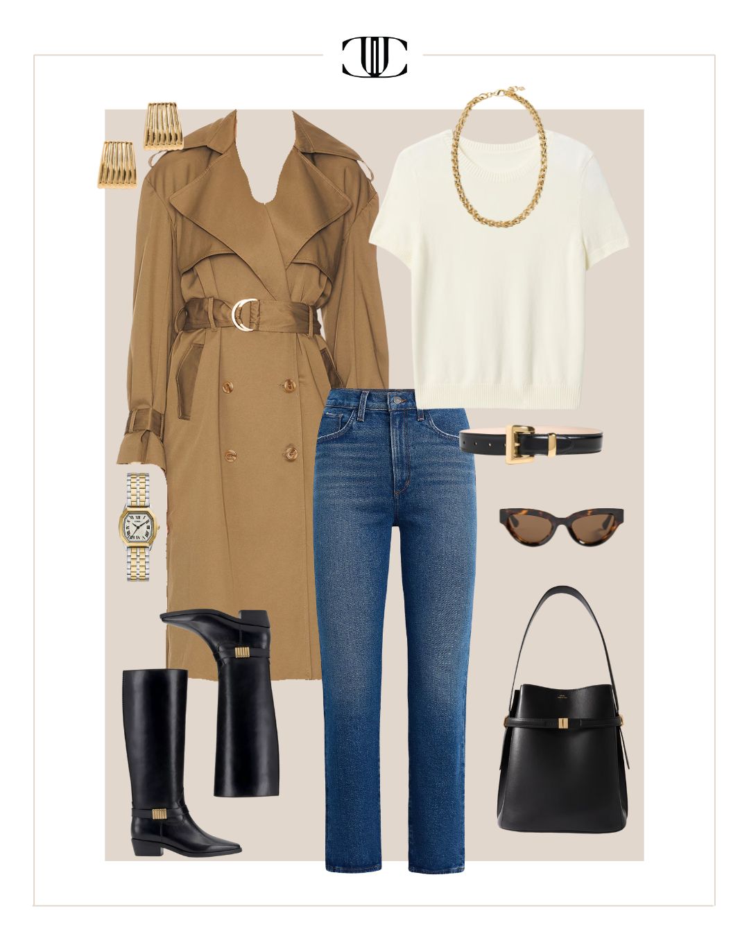 Coat, Top, Bottom, Belt, Shoes, Bag, Earrings, Necklace, Watch, Sunglasses