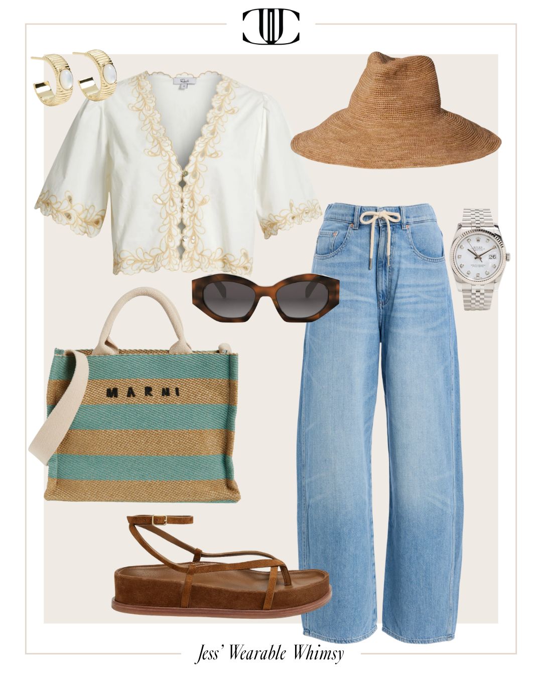 Top, Bottom, Shoes, Bag, Earrings, Watch, Sunglasses, Hat