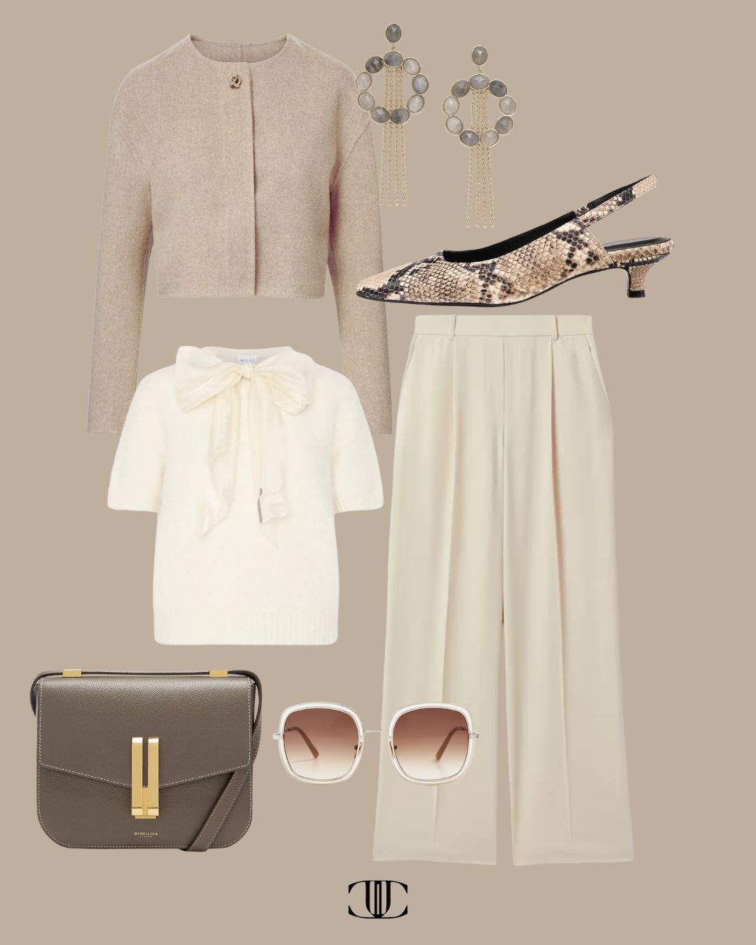 Cardigan, Top, Bottom, Shoes, Bag, Earrings, Sunglasses