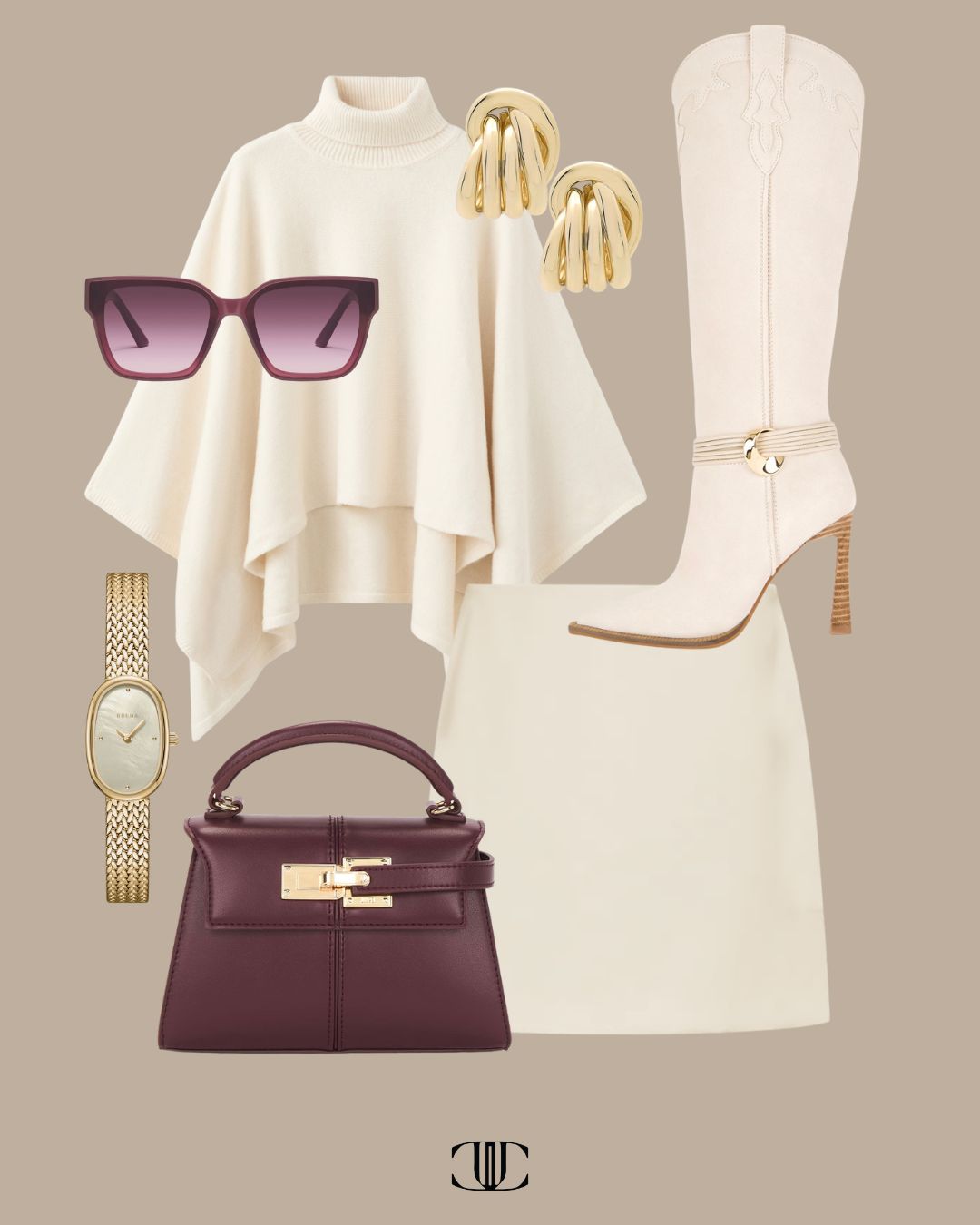 Cape, Skirt, Shoes, Bag, Earrings, Watch, Sunglasses